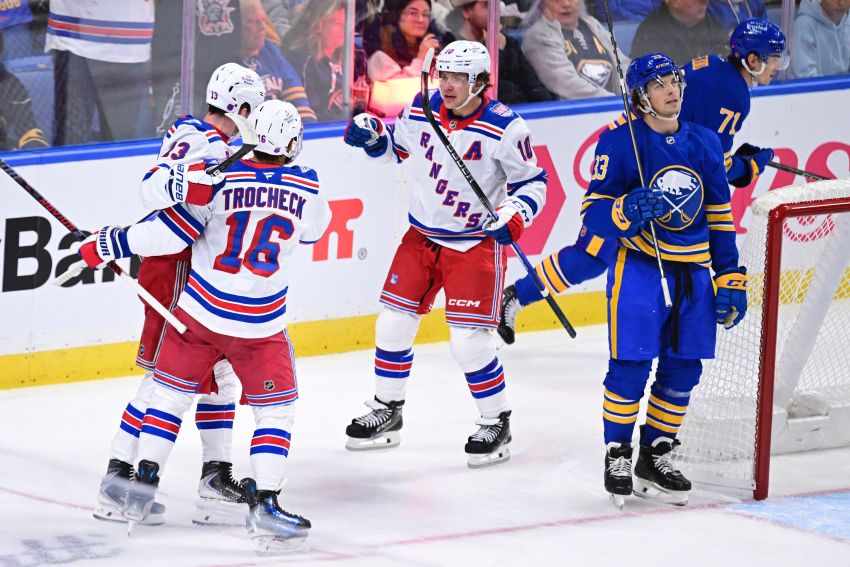 Alexis Lafreniere scored 11:43 into the game, converting a chance in the crease past Sabres goalie Alex Lyon, who looked sharp early and made 29 saves, including 15 in the first period.